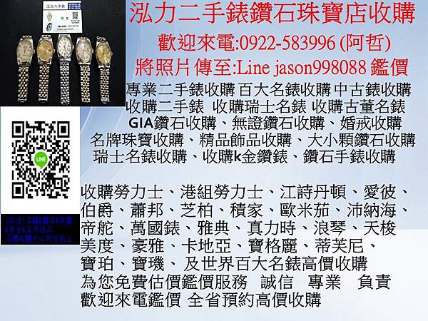 本公司 泓力二手錶鑽石珠寶店 專業經營高價腕錶鑽石珠寶收購買賣交流 泓力二手錶鑽石珠寶店 誠信永續經營 (非當舖體系)全省高價收購專線:0922583996 阿哲 泓力二手錶鑽石珠寶收購